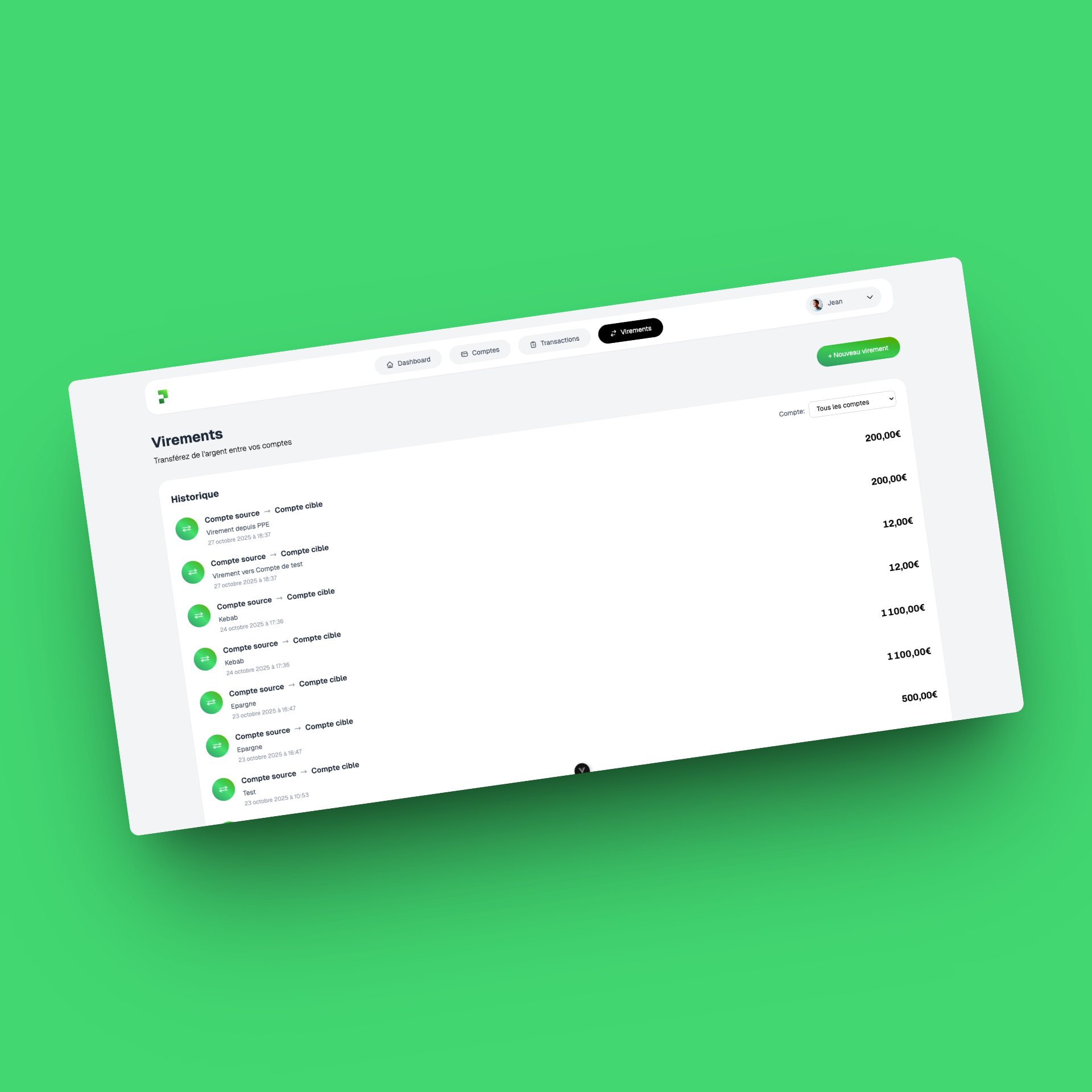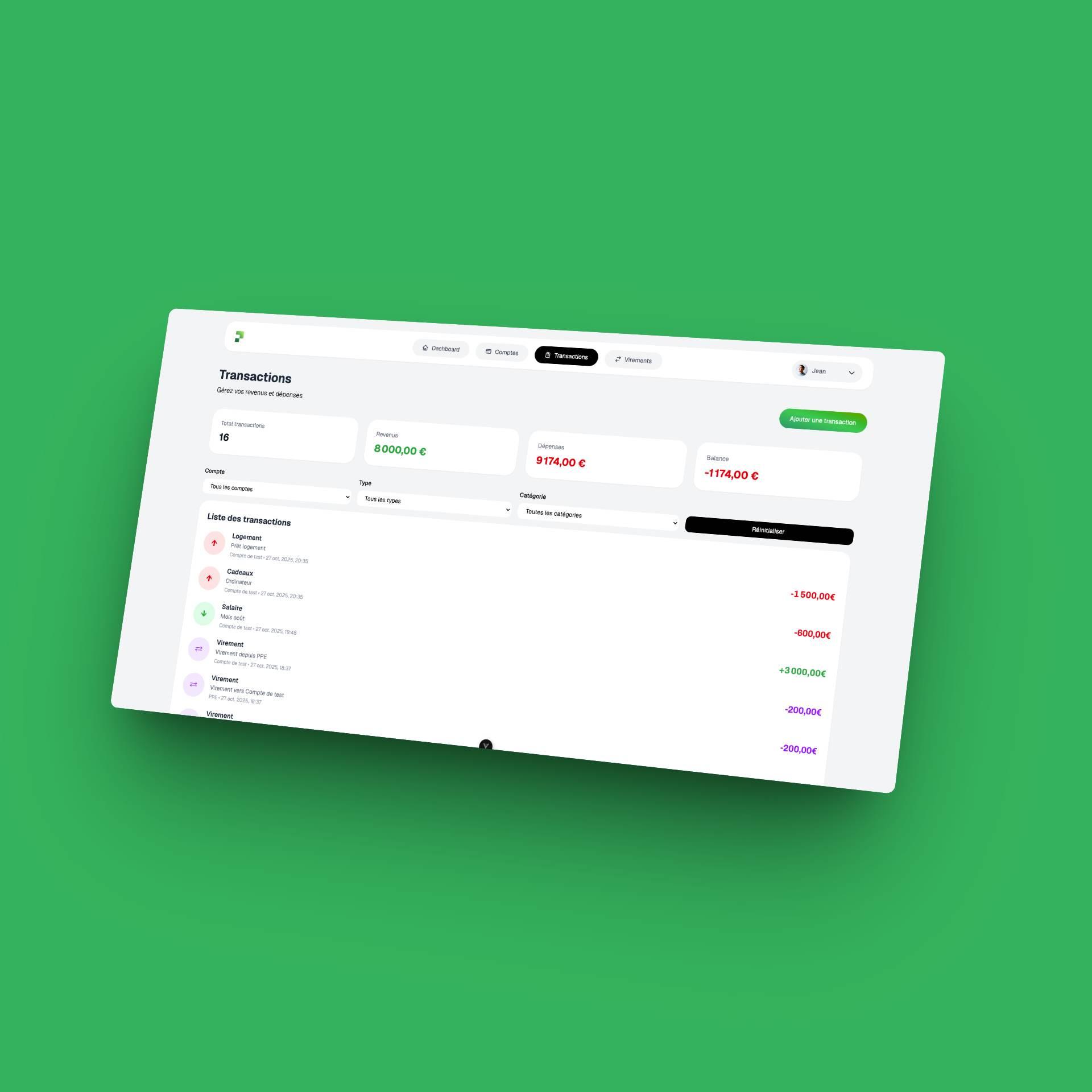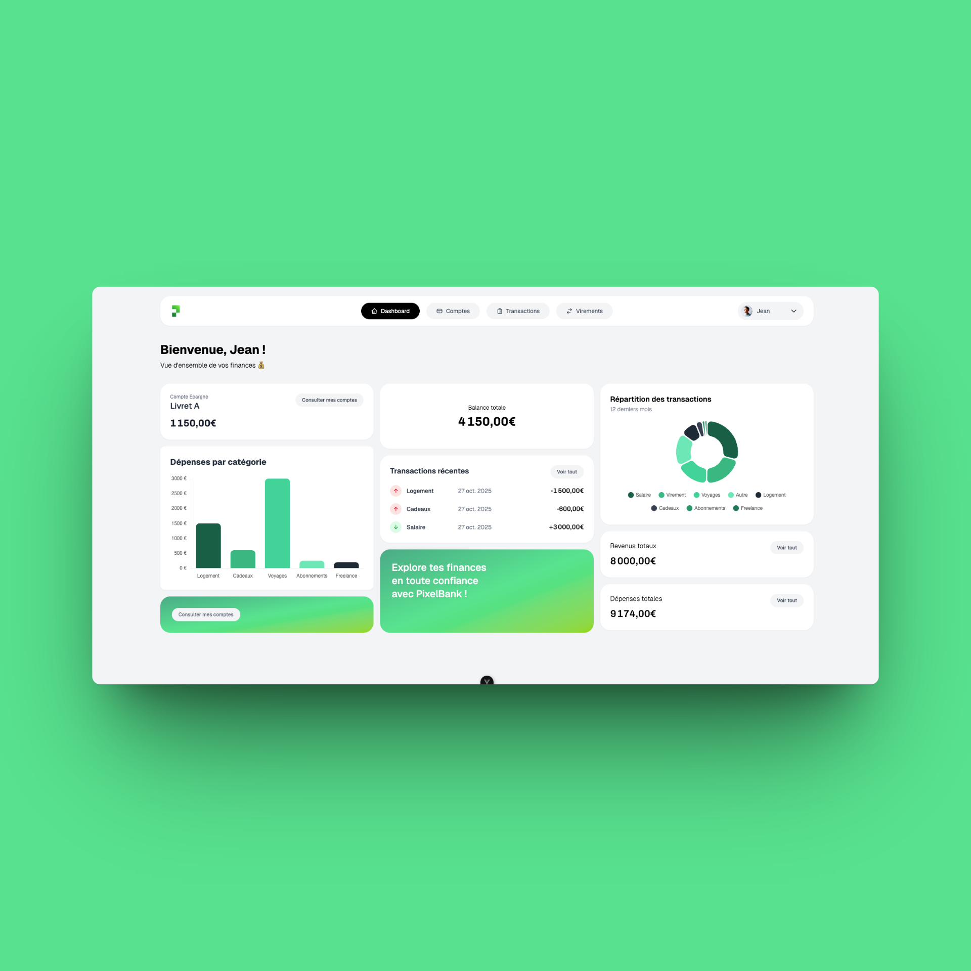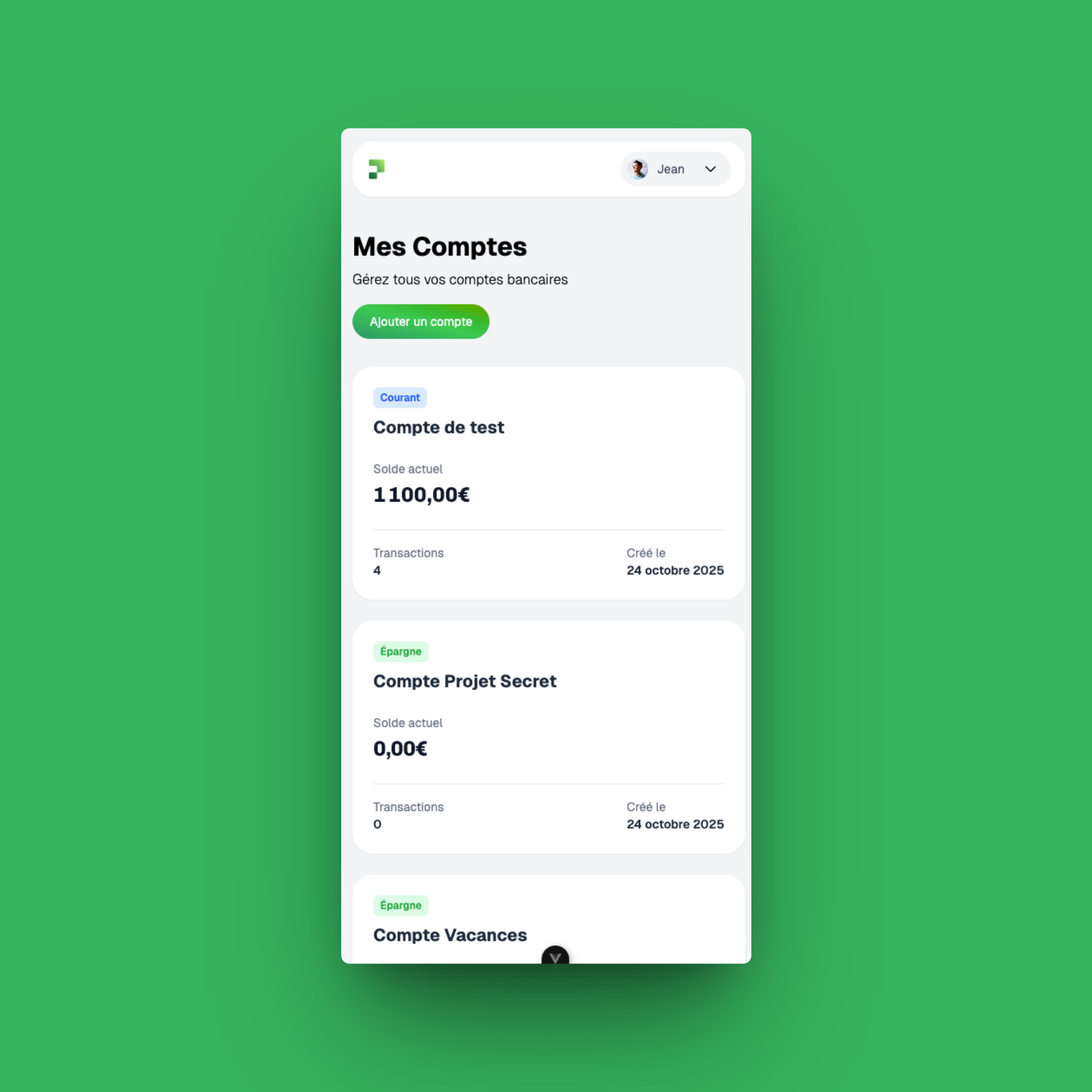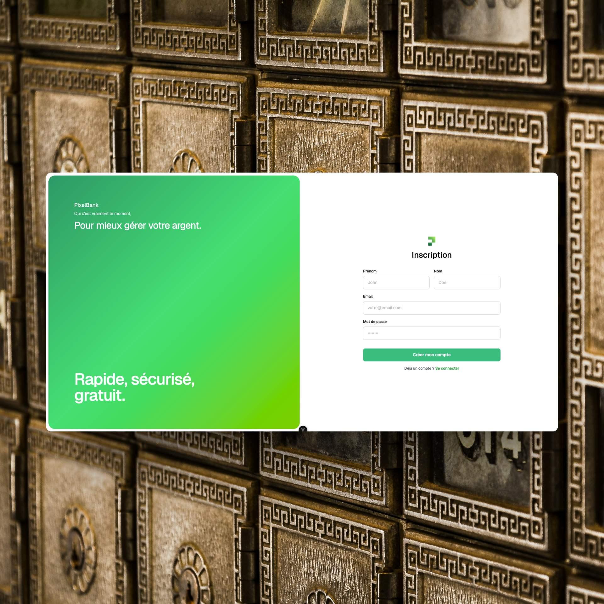 Ce projet perso est une web-app simulant un environnement bancaire, connexion/inscription, gestion de comptes, transactions, virements. Mise en place de transitions et animations pour une expérience utilisateur fluide et agréable.